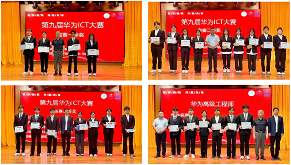 在技能竞赛、华为工程师职业认证表彰环节,校方、企业代表共同为学生颁奖。本次共计表彰36名竞赛学生和20名工程师职业认证学生,与会领导分别为获奖学生颁发证书及奖品。